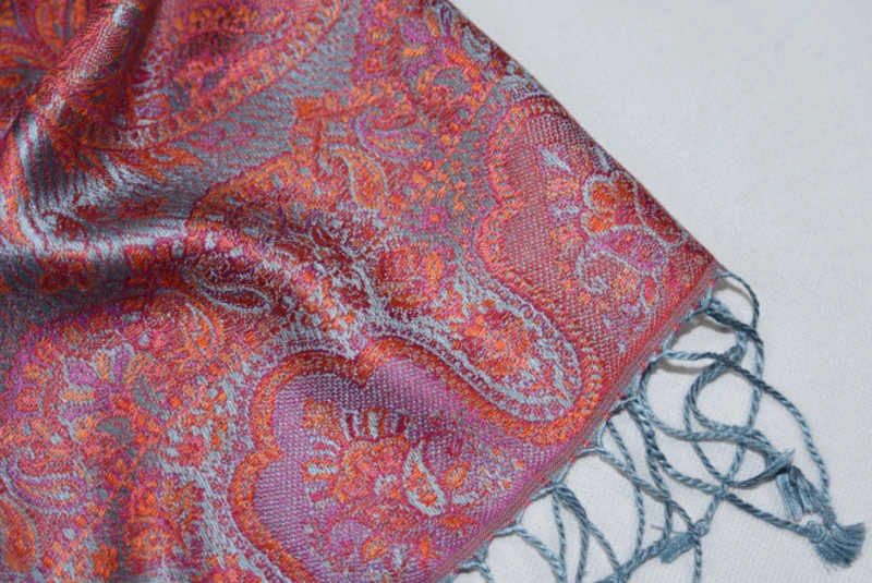 Velmi jemná luxusní hedvábná šála Jamawar v blankytně modré a oranžové barvě doplněné o fialovou a karmínově červenou s ornamenty, měnící barvy v různém odrazu světla. Rub a líc šály se liší. Na obou koncích je šála zakončena třásněmi v blankytně modré barvě.