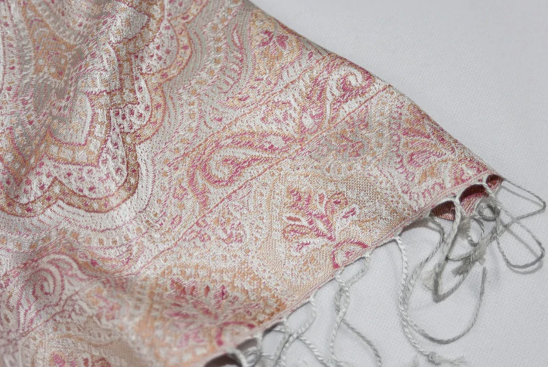 Velmi jemná luxusní hedvábná šála Jamawar ve světle šedé a růžové barvě s ornamenty doplněné o béžovou a karmínově červenou, měnící barvy v různém odrazu světla. Rub a líc šály se liší. Na obou koncích je šála zakončena světle šedými třásněmi.