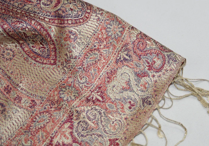 Velmi jemná hedvábná šála luxusního vzhledu v béžové a červené barvě s ornamenty a s odstíny noční modré a smetanové, měnící barvy v různém odrazu světla. Rub a líc šály se liší. Na obou koncích je šála zakončena béžovými třásněmi.