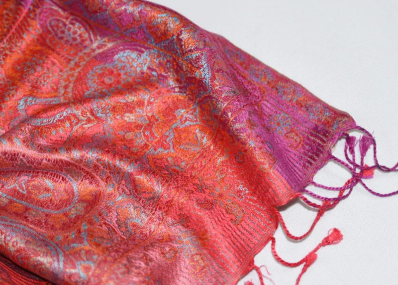 - Hedvábná šála Jamawar střední - Červená, růžová, fialová s ornamenty 4