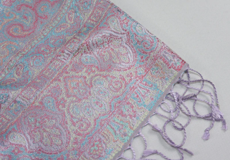 Velmi jemná luxusní hedvábná šála v šeříkové a růžové barvě doplněné o tyrkysovou a žlutou, měnící barvy v různém odrazu světla. Rub a líc šály se liší. Na obou koncích je šála zakončena třásněmi v šeříkové barvě.