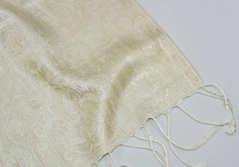 Velmi jemná luxusní hedvábná šála ve smetanové a okrově hnědé barvě s ornamenty, měnící barvy v různém odrazu světla. Rub a líc šály se liší. Na obou koncích je šála zakončena třásněmi ve smetanové barvě.