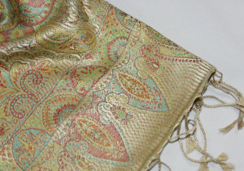 Velmi jemná hedvábná luxusní šála ve zlatobéžové barvě s ornamenty doplněná o odstíny azurové, mátově zelené, červené a žluté, měnící barvy v různém odrazu světla. Rub a líc šály se liší. Na obou koncích je šála zakončena zlatobéžovými třásněmi.