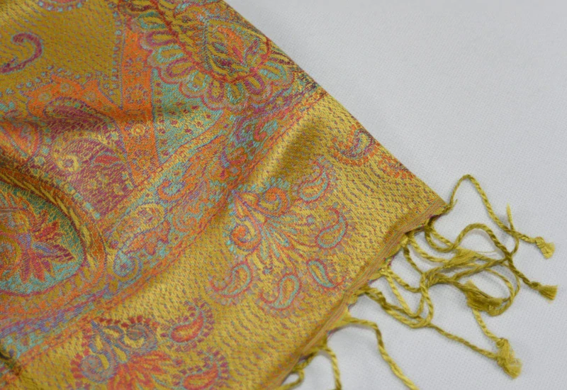 Velmi jemná hedvábná šála luxusního vzhledu ve žlutozlaté barvě s ornamenty a s odstíny tyrkysové, růžové a oranžové, měnící barvy v různém odrazu světla. Rub a líc šály se liší. Na obou koncích je šála zakončena žlutozlatými třásněmi.