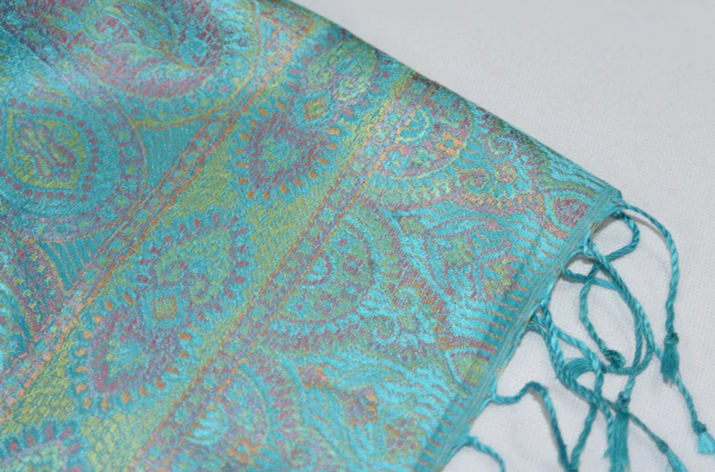 Velmi jemná hedvábná šála luxusního vzhledu v barvě azurové s odstíny růžové a jablíčkově zelené, měnící barvy v různém odrazu světla. Rub a líc šály se liší. Na obou koncích je šála zakončena třásněmi v azurové barvě.