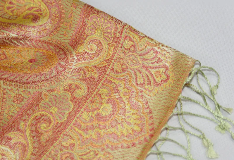 Velmi jemná luxusní hedvábná šála s ornamenty v béžové a červené barvě doplněné o růžovou a žlutou, měnící barvy v různém odrazu světla. Rub a líc šály se liší. Na obou koncích je šála zakončena světle zelenými třásněmi.