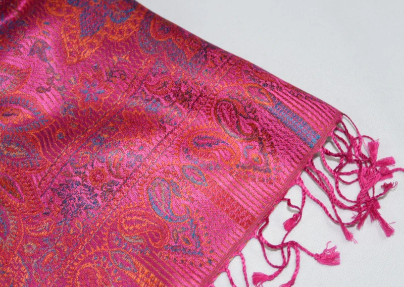 Velmi jemná hedvábná šála luxusního vzhledu v růžové barvě doplněné o oranžovou, nebesky modrou a červenou, měnící barvy v různém odrazu světla. Rub a líc šály se liší. Na obou koncích je šála zakončena třásněmi v růžové barvě.