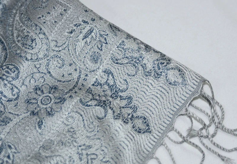 Velmi jemná luxusní hedvábná šála v šedé a noční modré barvě s ornamenty, měnící barvy v různém odrazu světla. Rub a líc šály se liší. Na obou koncích je šála zakončena šedými třásněmi.
