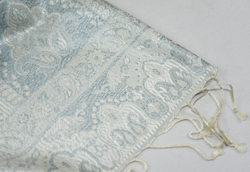 Velmi jemná luxusní hedvábná šála ve smetanové a blankytně modré barvě s ornamenty, měnící barvy v různém odrazu světla. Rub a líc šály se liší. Na obou koncích je šála zakončena třásněmi ve smetanové barvě.