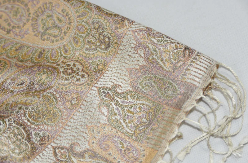 - Hedvábná šála Jamawar velká - Smetanová a okrově hnědá s ornamenty