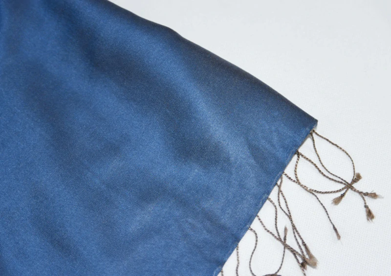Velmi jemná hedvábná šála v královské modré barvě. Na rubové straně je šála protkána hnědými nitěmi. Na obou koncích je šála zakončena tenkými hnědými třásněmi.