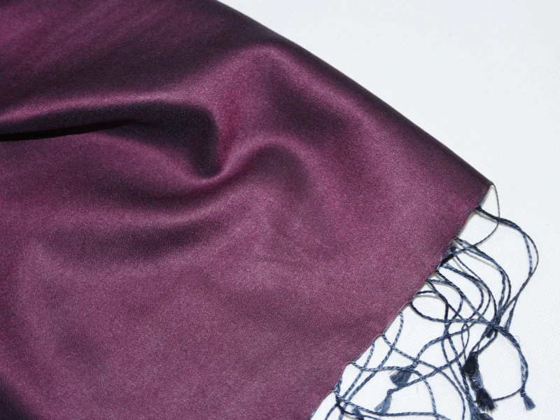 Velmi jemná hedvábná šála ve vínové barvě. Na rubové straně je šála protkána nitěmi v noční modré barvě. Na obou koncích je šála zakončena tenkými třásněmi v noční modré barvě.