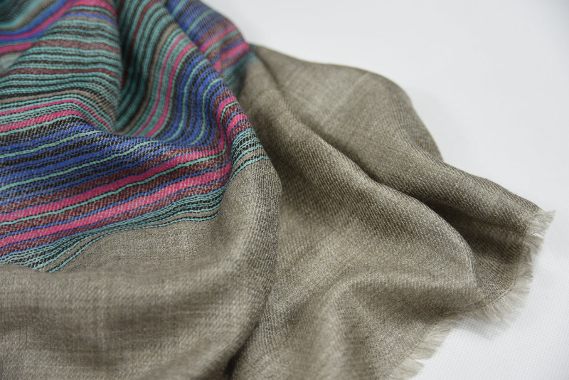 Vlněná šála ze superjemné podsadové jehněčí vlny. Světle hnědá šála s četnými růžovými, modrými, zelenými a černými pruhy. Šála je z jednovrstvé látky a tkaná přímo v indickém Kašmíru. Díky své velikosti má šála řadu možností využití. V zimě se do ní lze příjemně zachumlat, v teplejších měsících může sloužit jako elegantní doplněk.